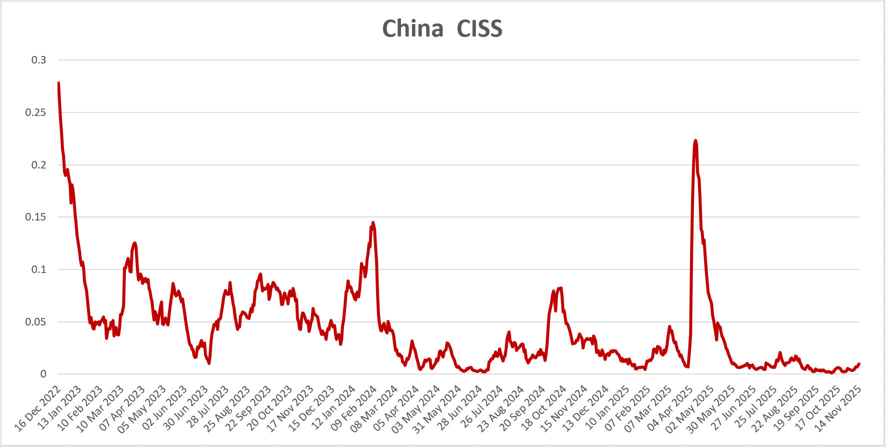北大国发院宏观与绿色金融实验室持续跟踪China CISS (composite index of systemic stress)指数,用于监测中国金融市场的系统性风险。China CISS指数由实验室课题组与欧洲中央银行(ECB)金融市场部合作开发,数据每日更新。指标值在(0,1)之间,数值越高表示金融风险水平越高。