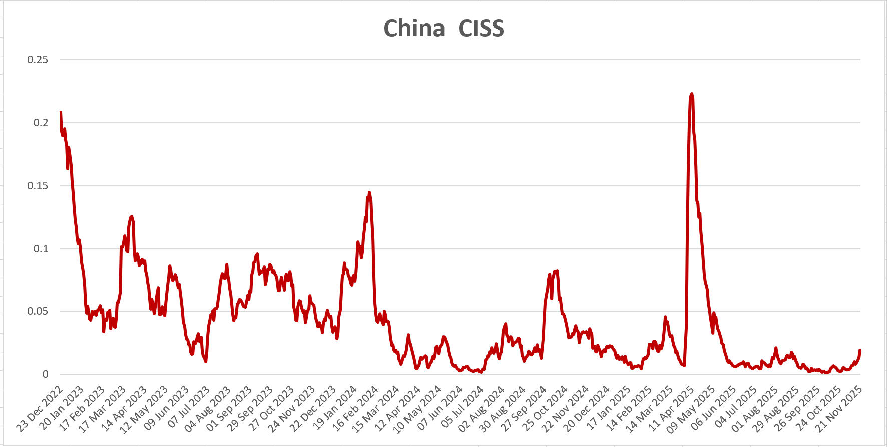 北大国发院宏观与绿色金融实验室持续跟踪China CISS (composite index of systemic stress)指数,用于监测中国金融市场的系统性风险。China CISS指数由实验室课题组与欧洲中央银行(ECB)金融市场部合作开发,数据每日更新。指标值在(0,1)之间,数值越高表示金融风险水平越高。